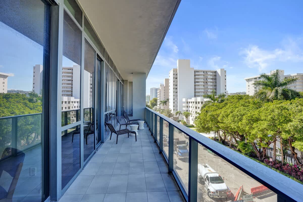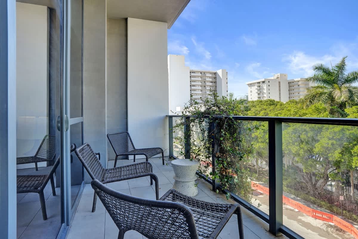 - Private balcony with city views and seating area