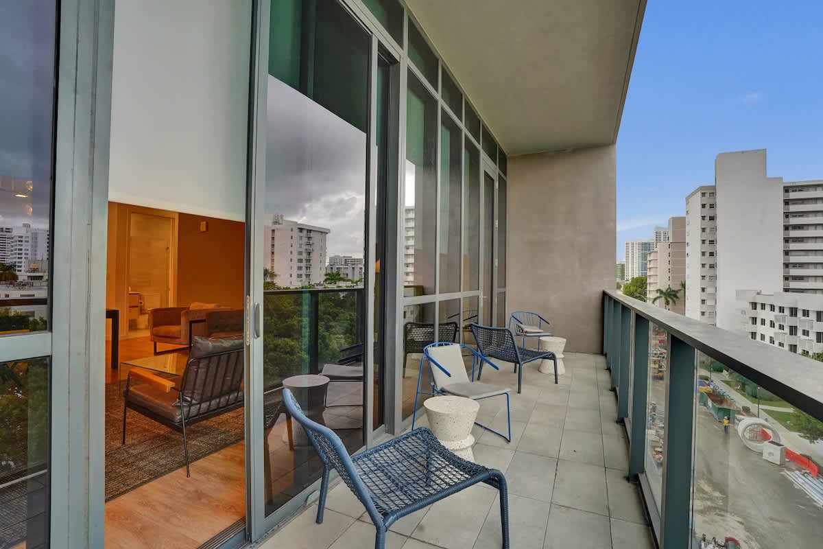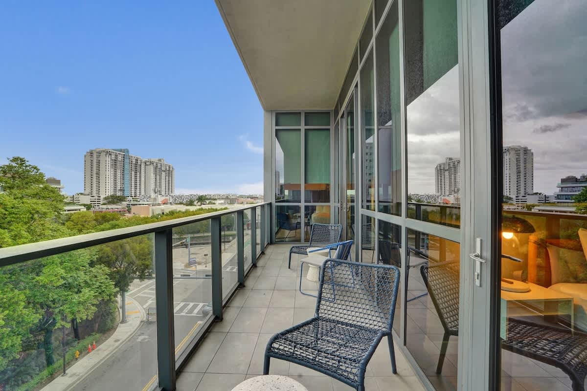 - Private balcony with city views and seating area