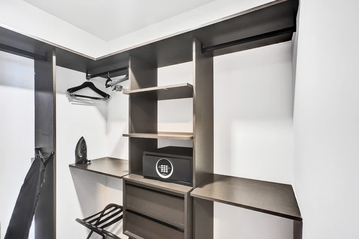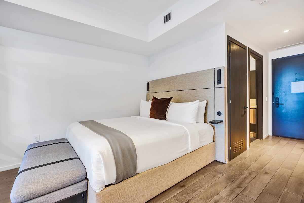 - A plush queen bed invites deep, restful sleep with hotel-quality linens