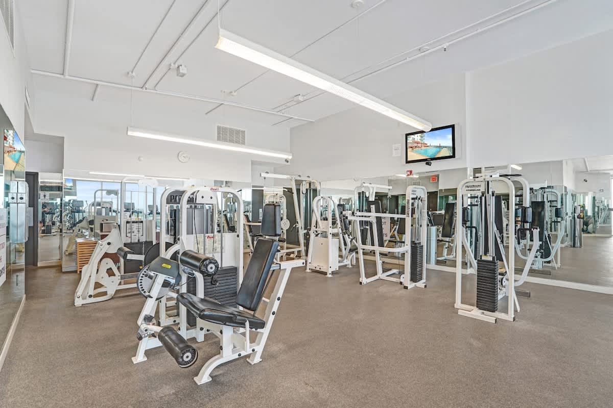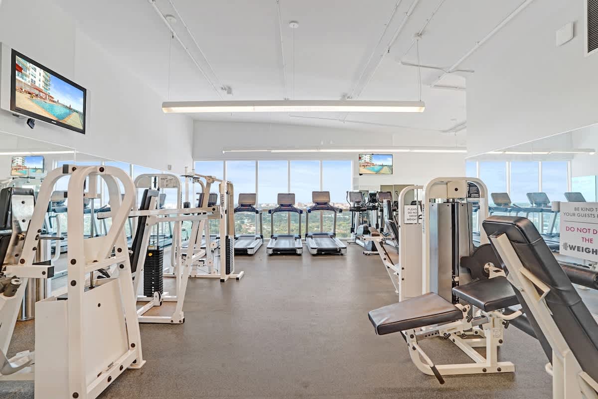 - Rooftop fitness center with skyline views and locker facilities