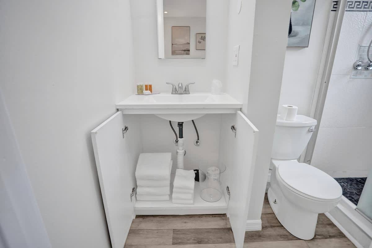 - Clean, modern bathroom with towels and toiletries