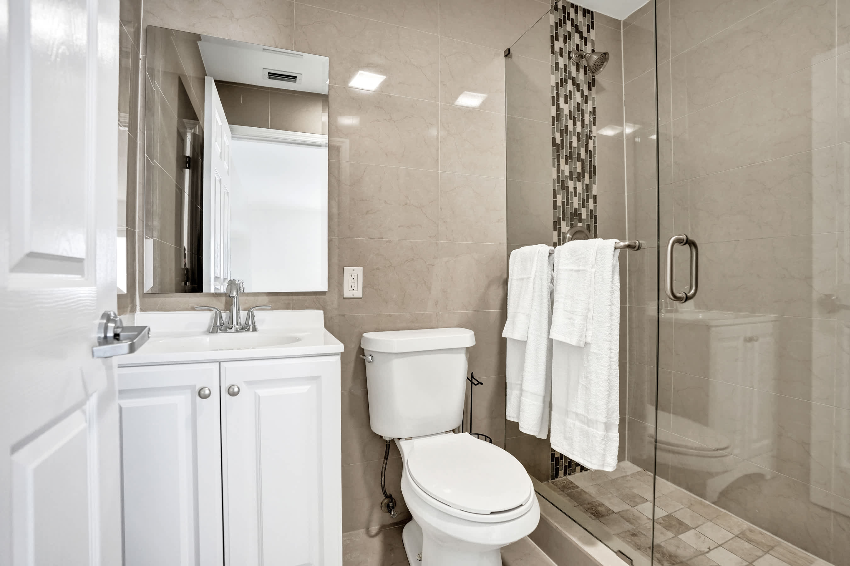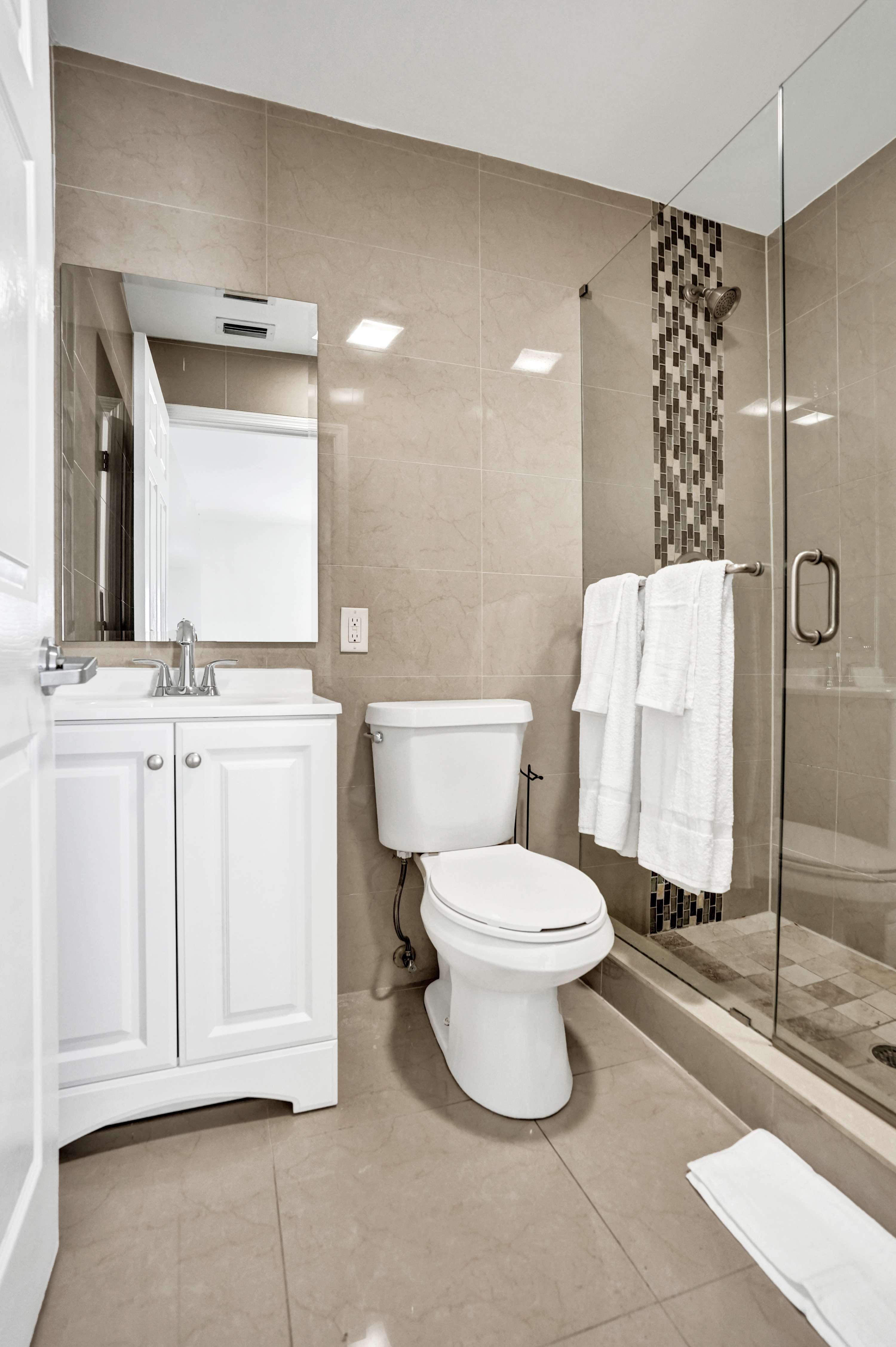Modern bathroom with walk-in shower, fresh towels, and toiletries