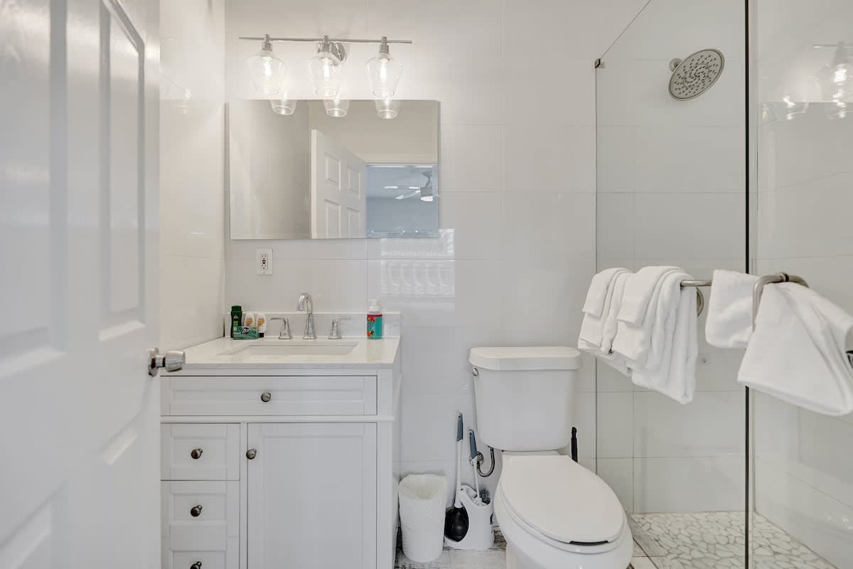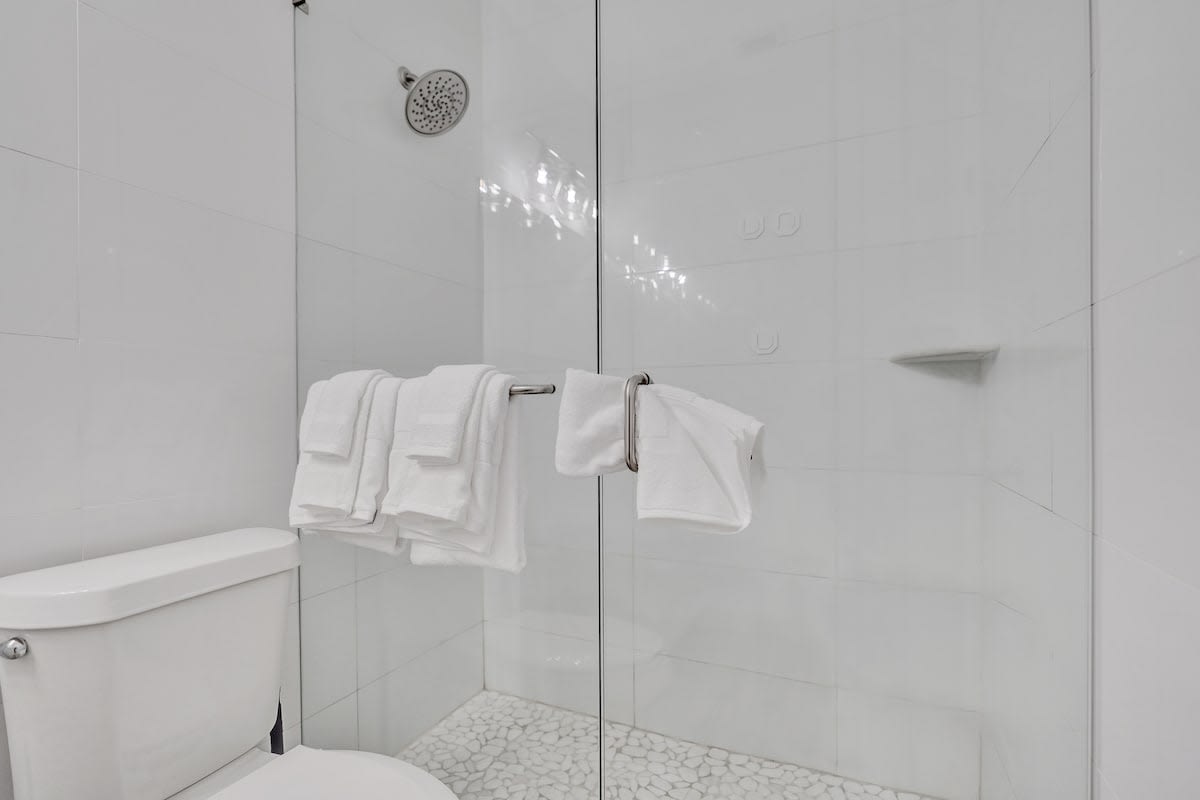 - Modern bathroom with walk-in shower, fresh towels, and starter toiletries