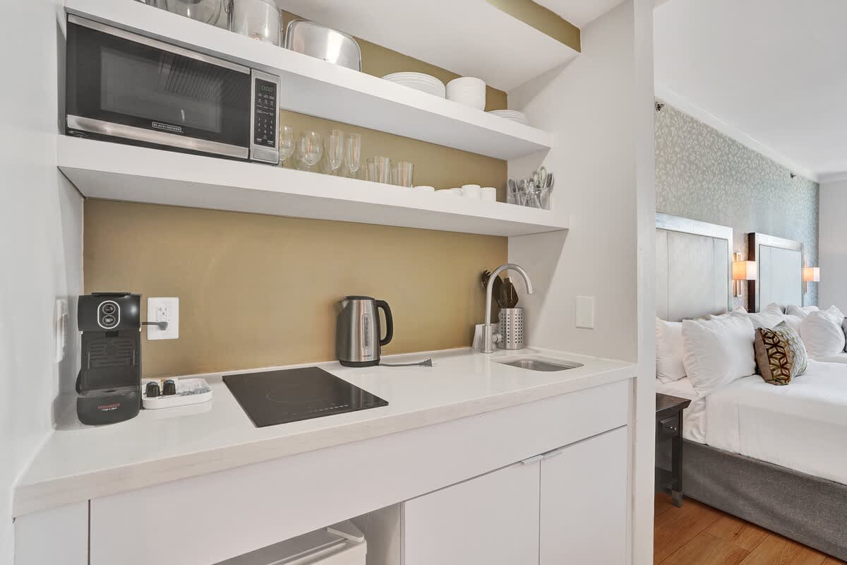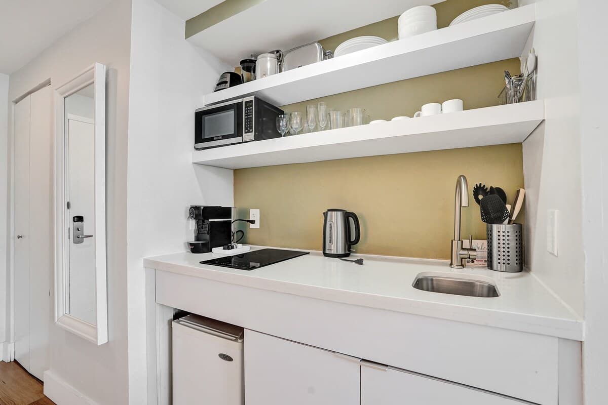 - Kitchenette equipped with a mini fridge, microwave, sink, coffee maker, and essentials