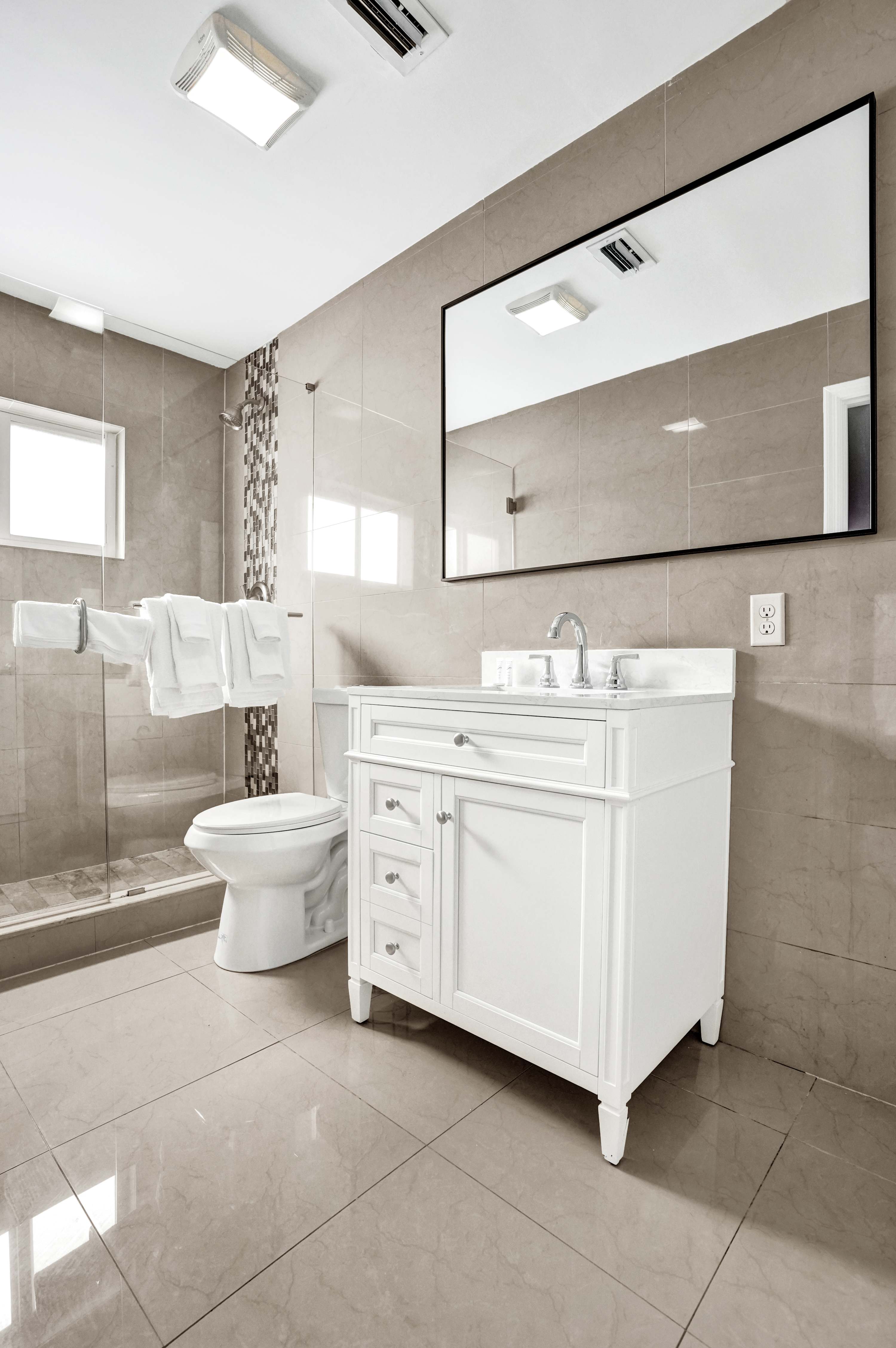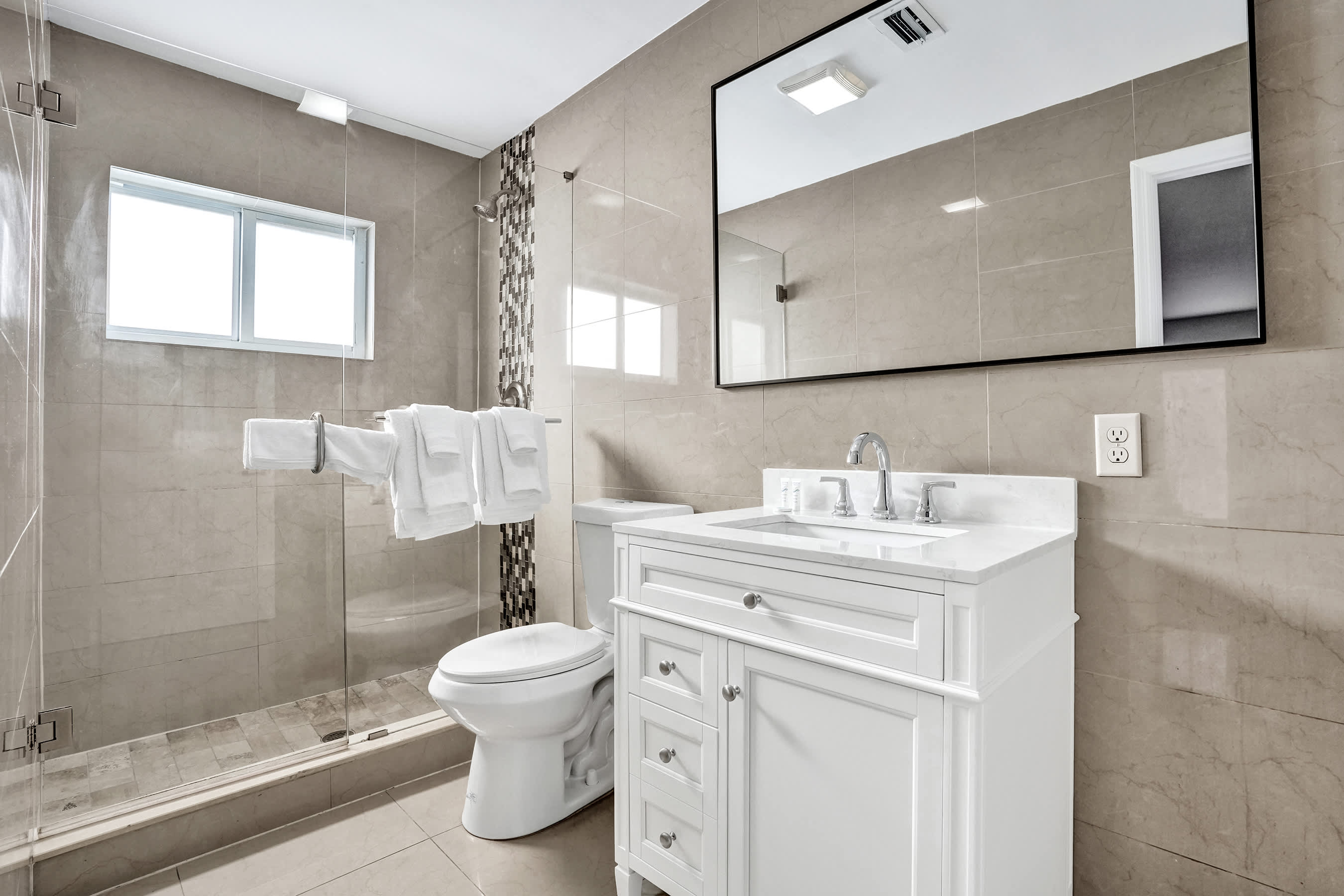 Modern bathroom with walk-in shower, fresh towels, and toiletries