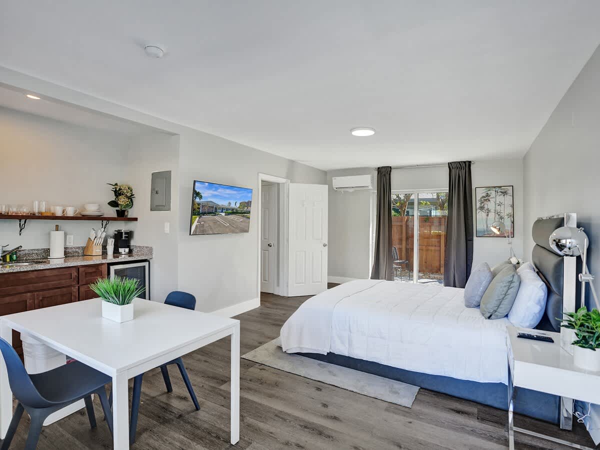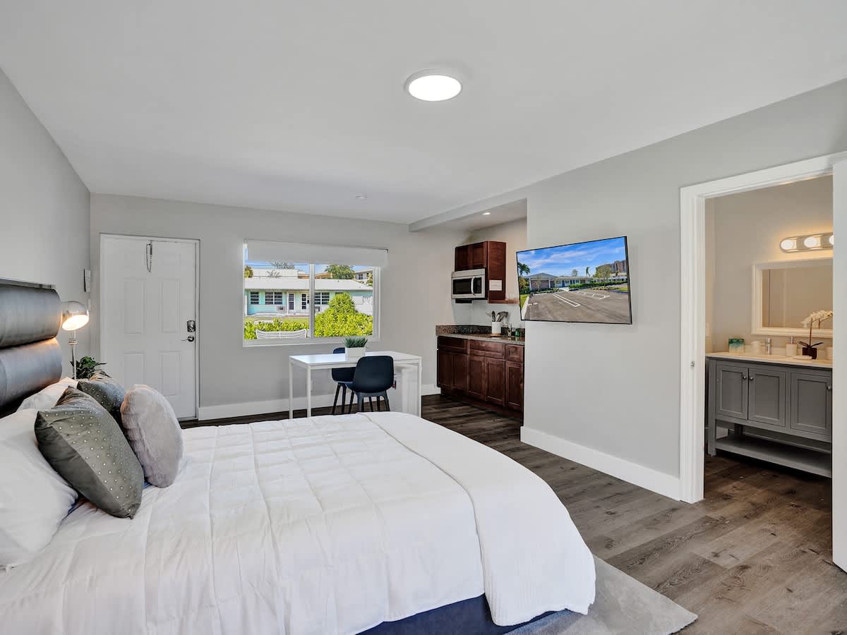 Welcome to Pelican Cove, managed by Stay Hospitality. Our cozy studio apartments are just steps from Pompano Beach on a quiet street. Each unit features a comfortable bed, well-equipped kitchenette, TV, high-speed Wi-Fi, bathroom, and a private back patio. The front turf area offers communal seating to enjoy the coastal ambiance. Ideal for solo travelers, couples, or small families seeking a coastal getaway. Book your stay today and experience the best of Pompano Beach!