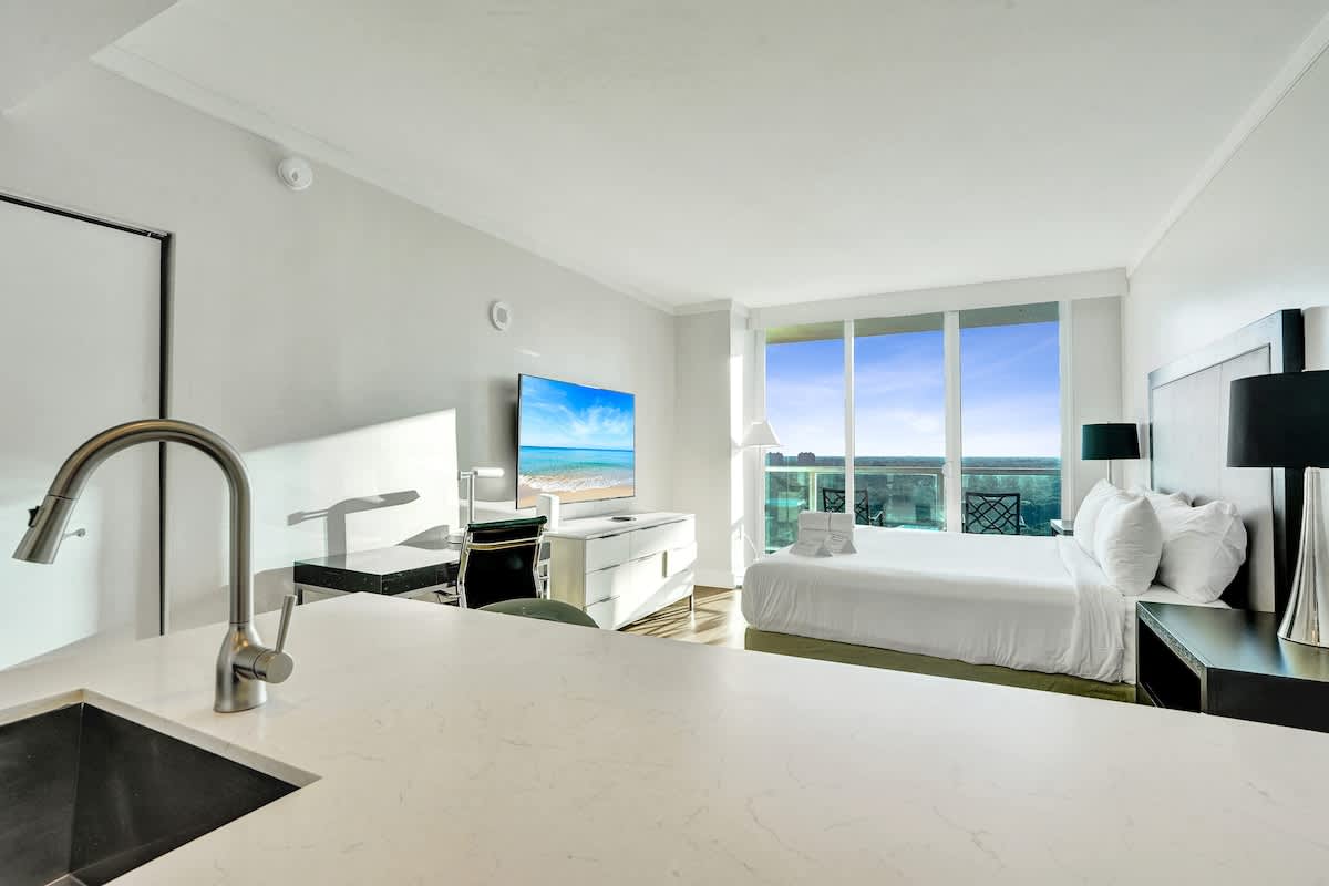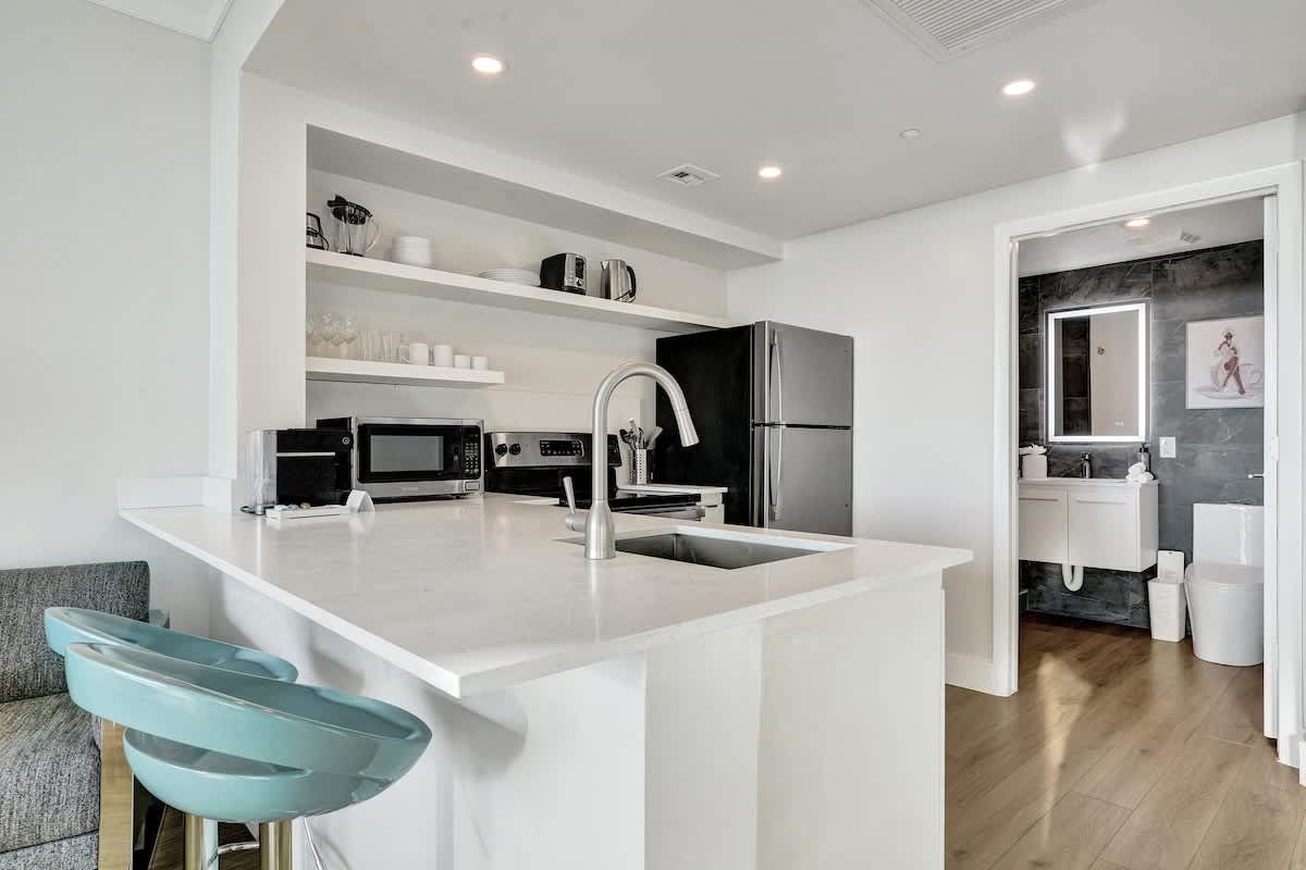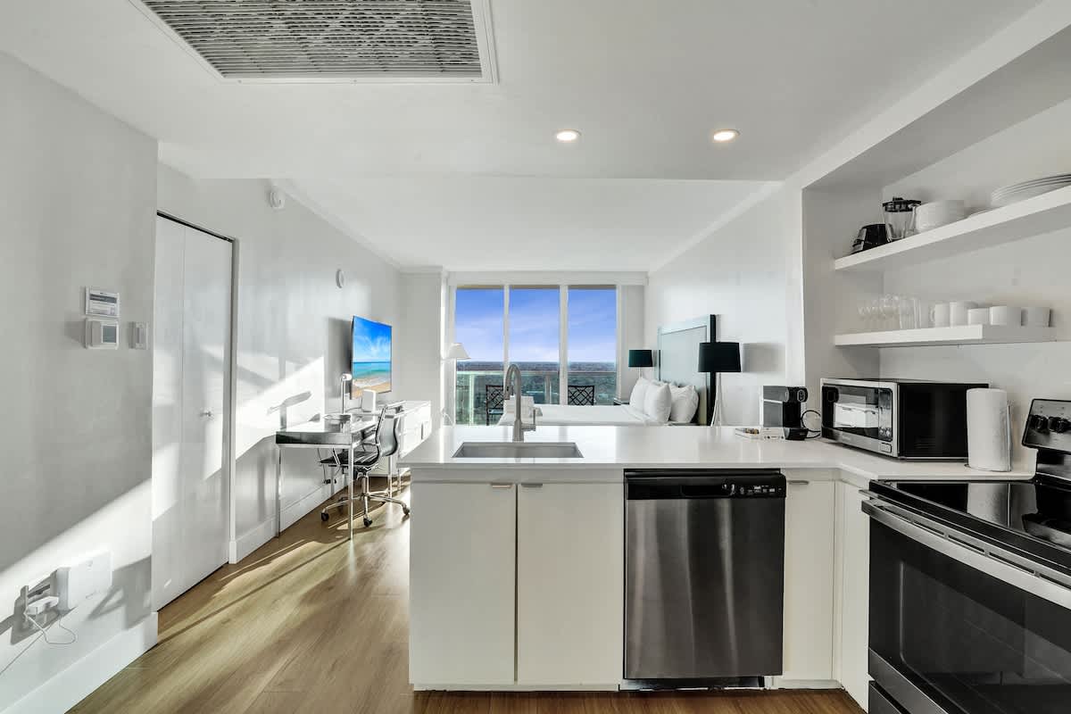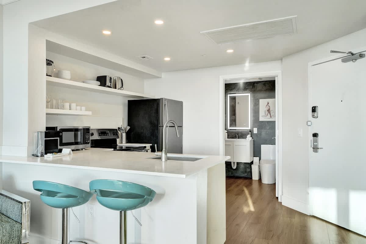 Enjoy stunning bay and city views from this modern 17th-floor 2-bedroom setup at The Arya. Designed for comfort and convenience, the space features two private studios, each with a kitchen, Smart TV, fast WiFi, and two full bathrooms total—perfect for both relaxing and remote work.