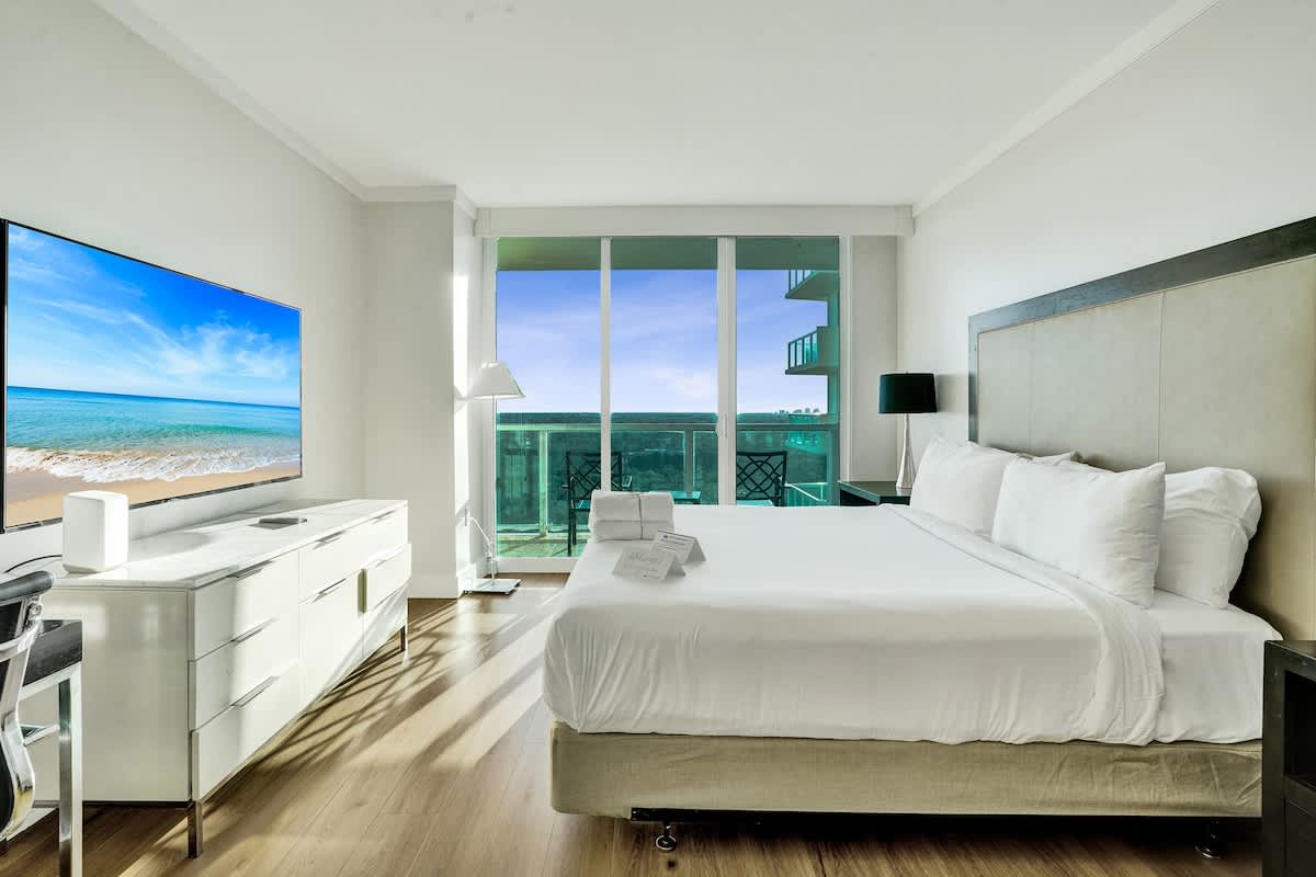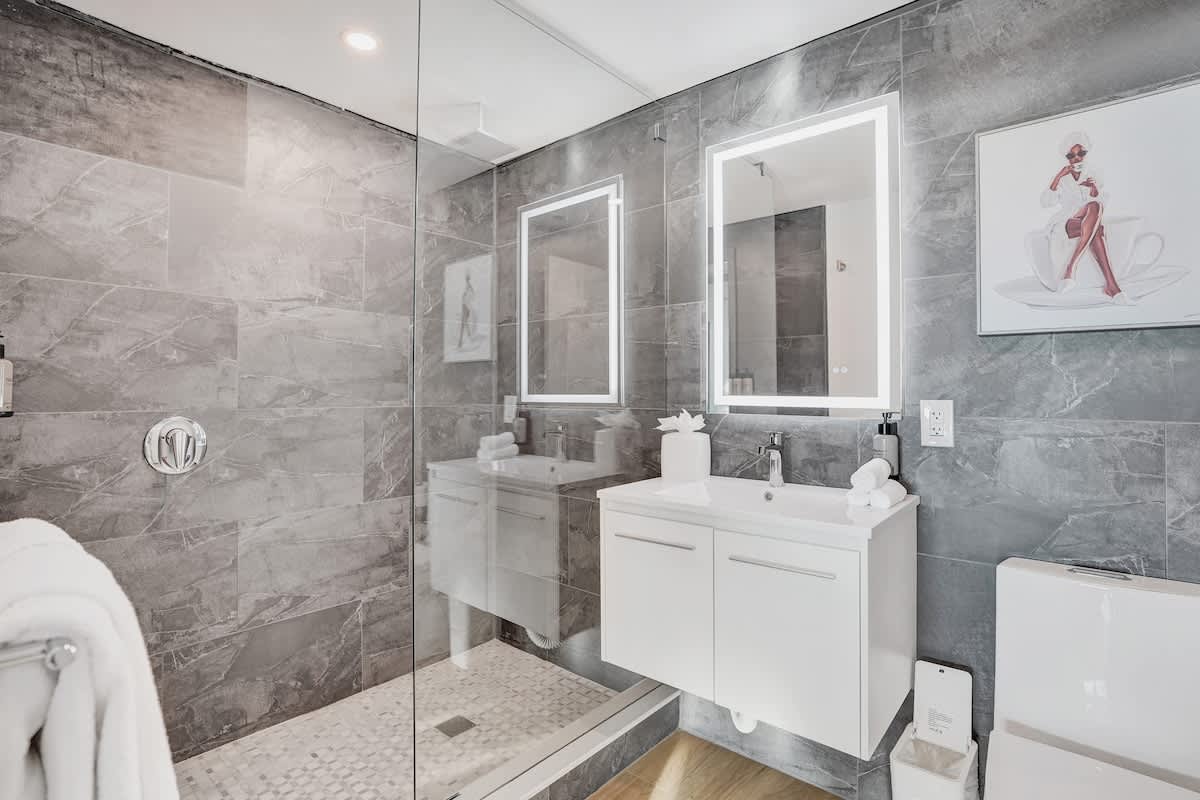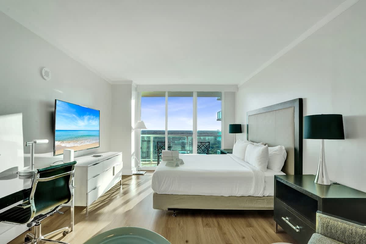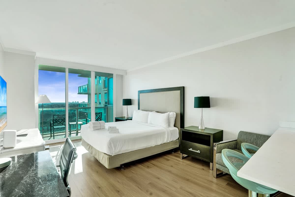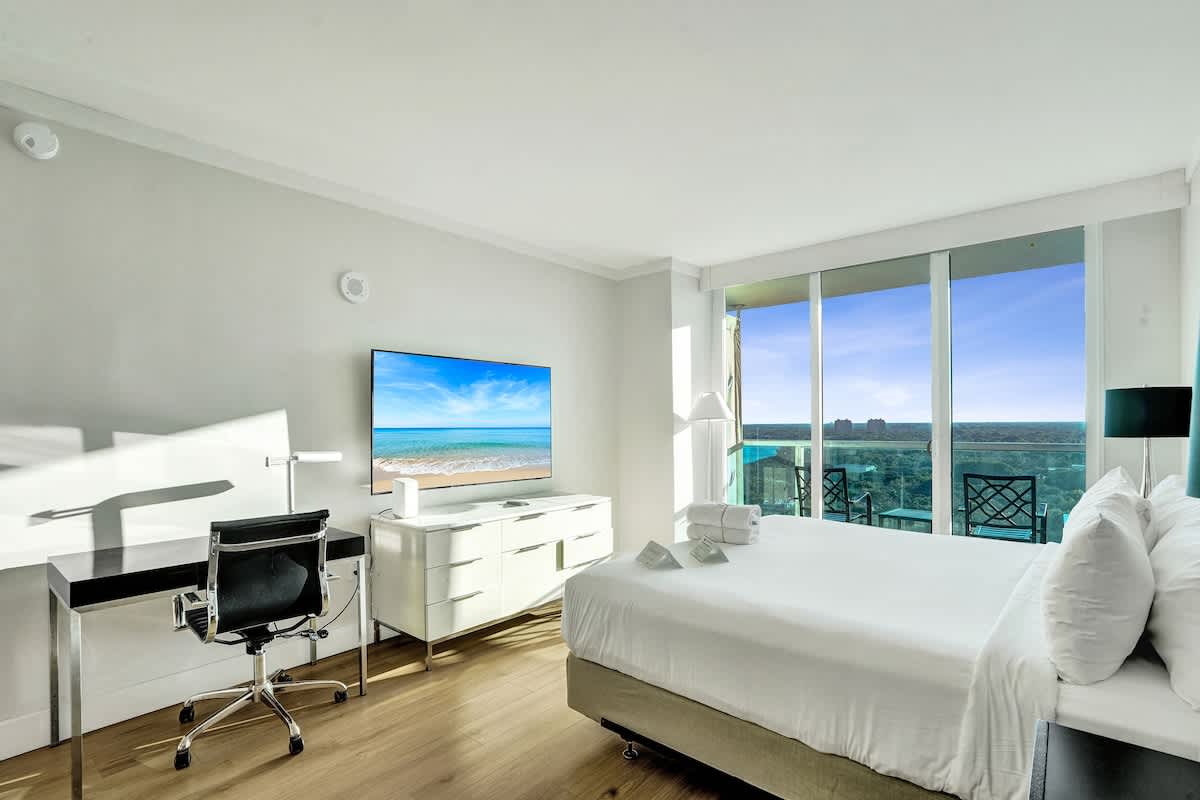 Enjoy stunning bay and city views from this modern 17th-floor 2-bedroom setup at The Arya. Designed for comfort and convenience, the space features two private studios, each with a kitchen, Smart TV, fast WiFi, and two full bathrooms total—perfect for both relaxing and remote work.