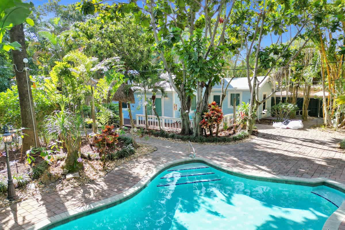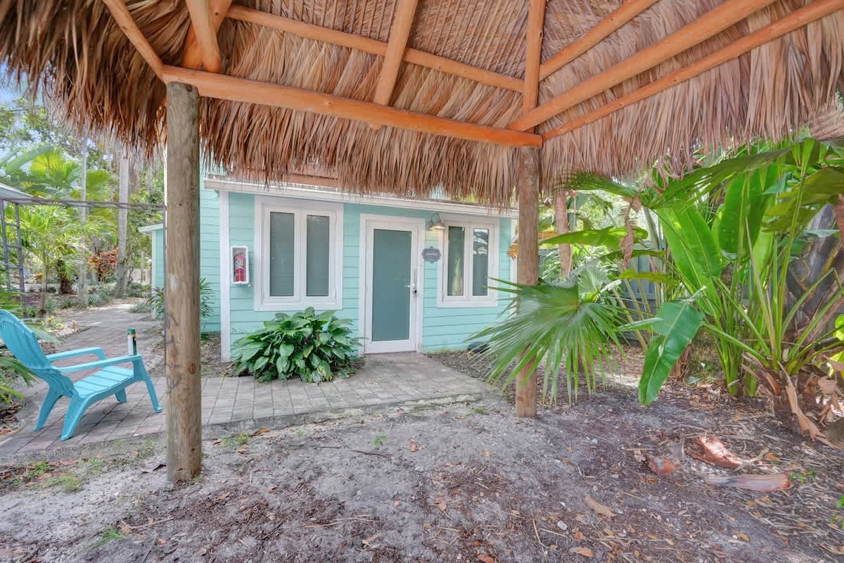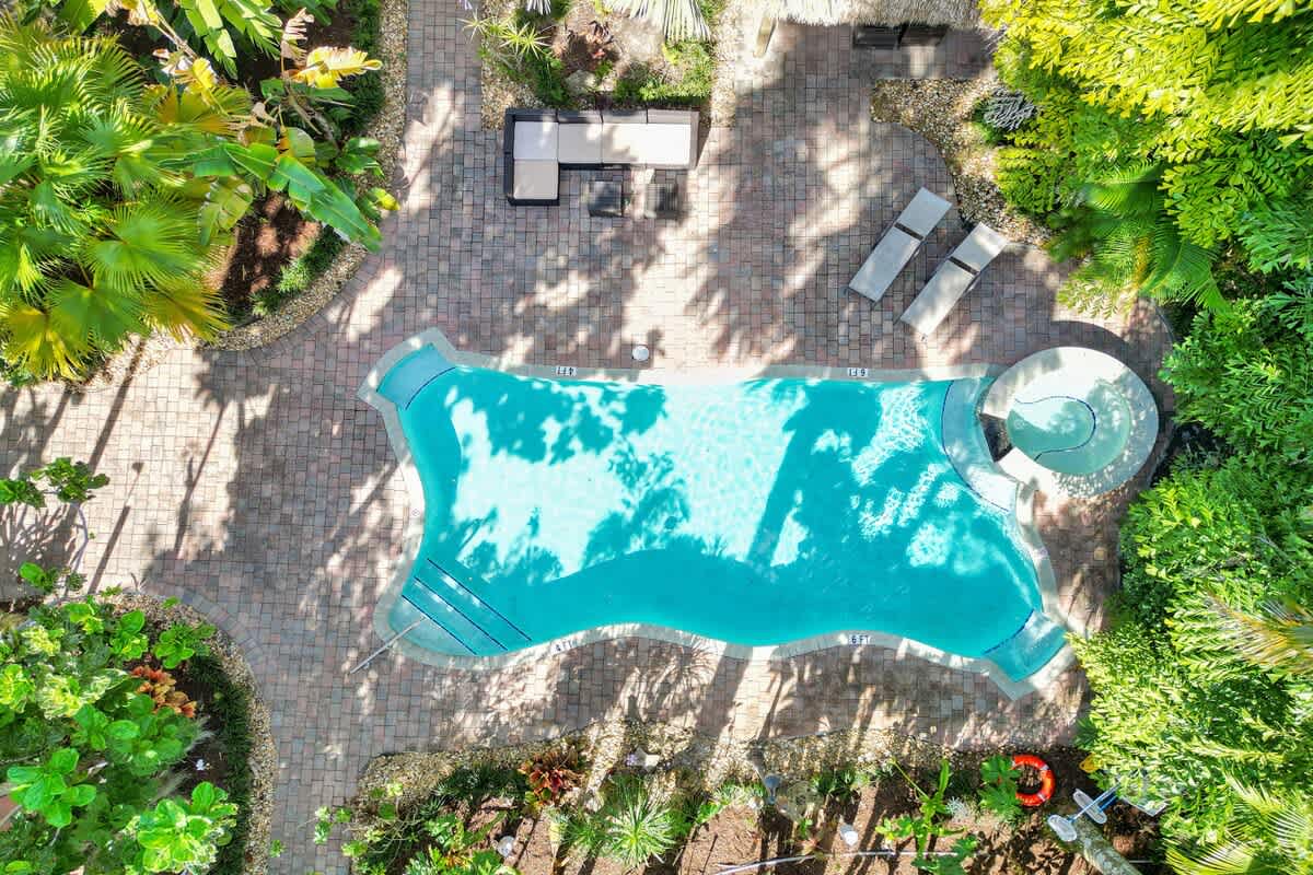 - Access to shared tropical courtyard with pool, hot tub, and outdoor lounge under a Tiki Hut.