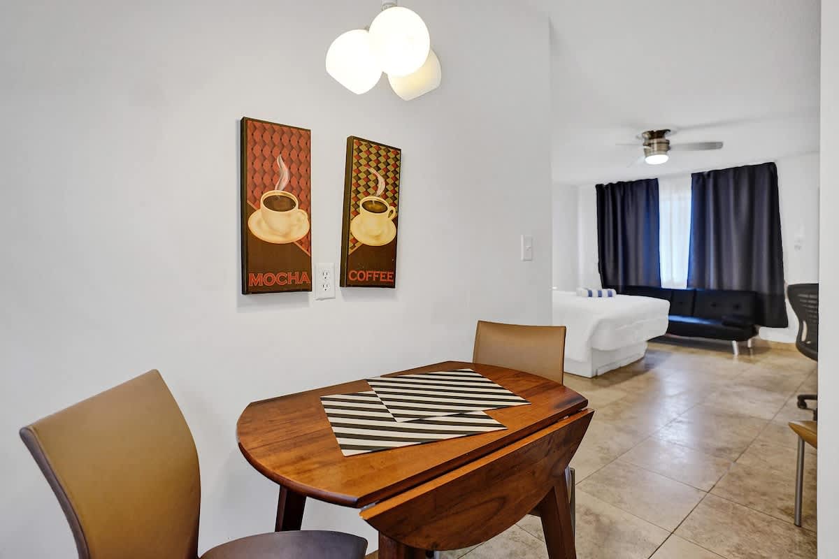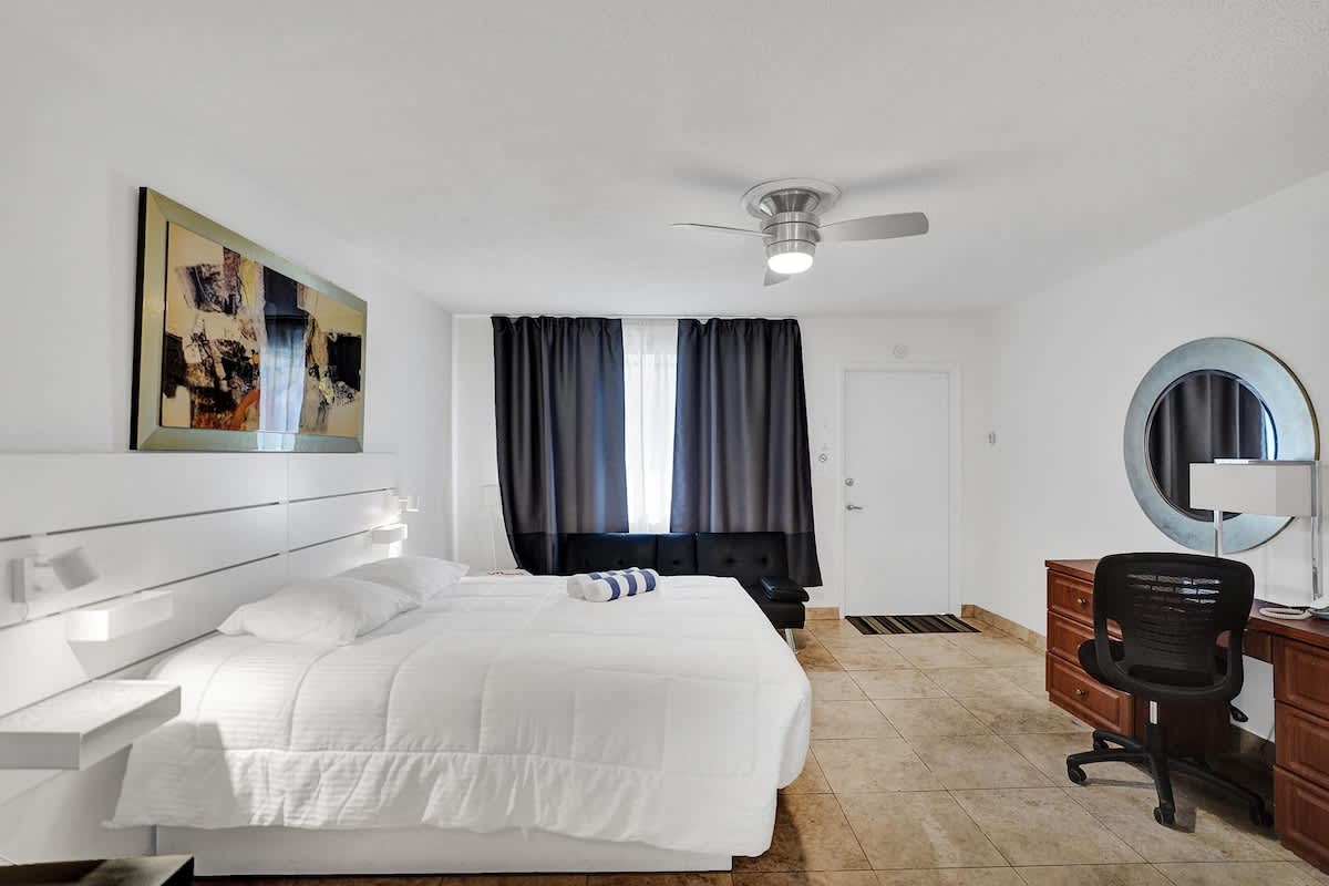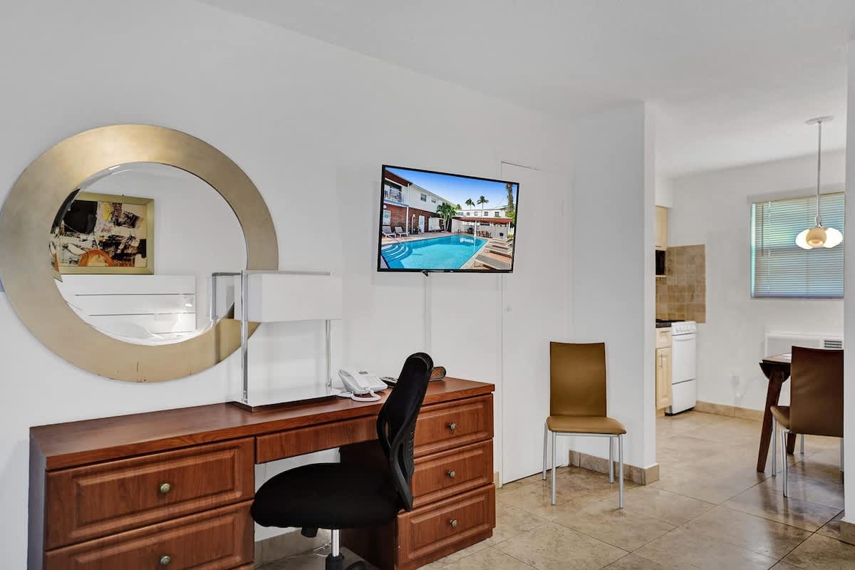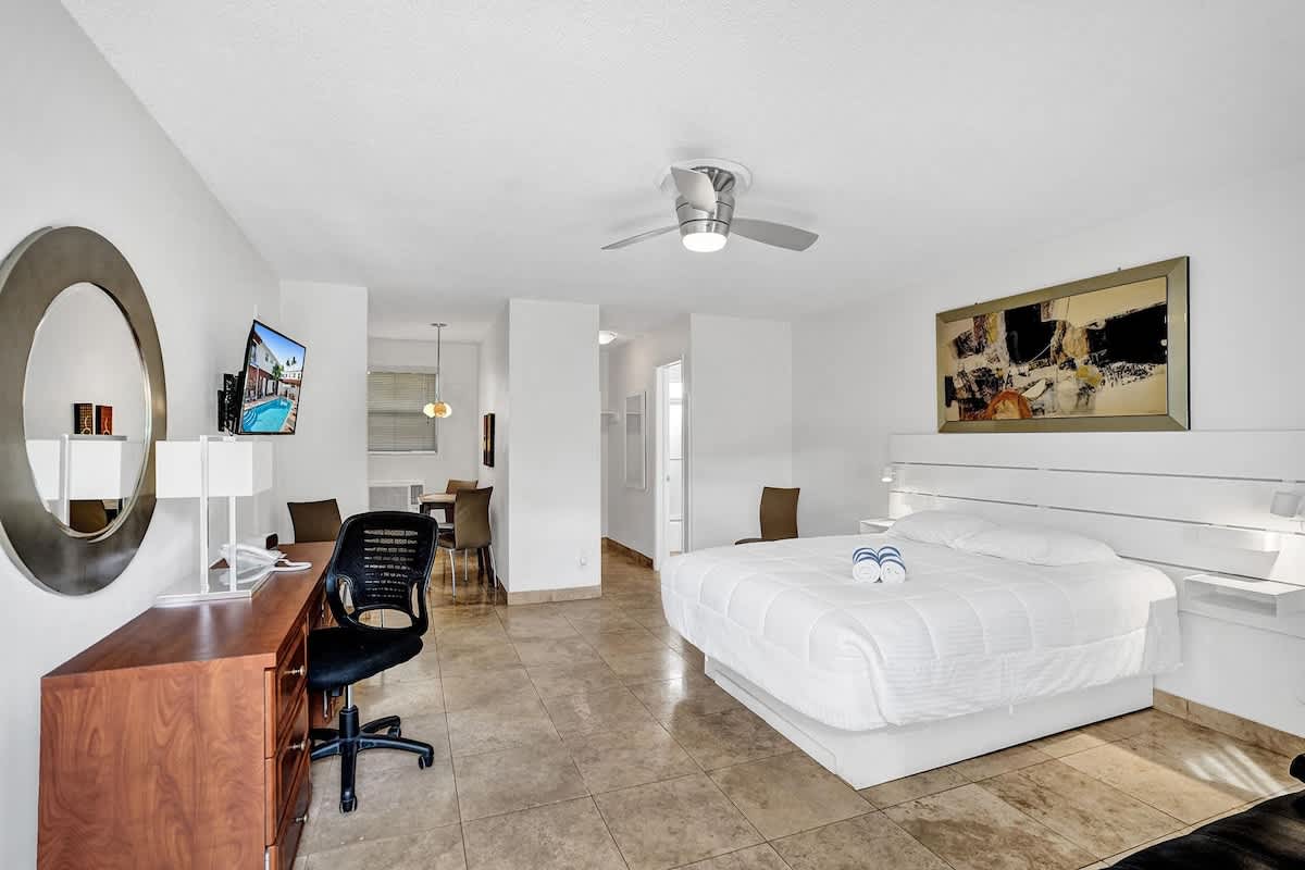 Welcome to Waves, a 20-unit complex in the heart of Pompano Beach, Florida. This studio apartment has a spacious living area that has a double bed for 2 guests, a desk workspace, kitchen, and a gated pool on property for you to lounge under the sun. We are within walking distance from the beach and ample restaurants, nightlife and attractions to choose from. This apartment sleeps 4 guests, and is the perfect getaway for friends, family, or a work trip!